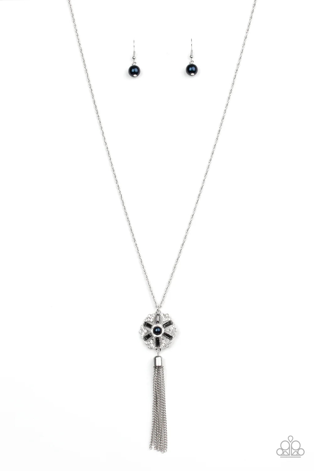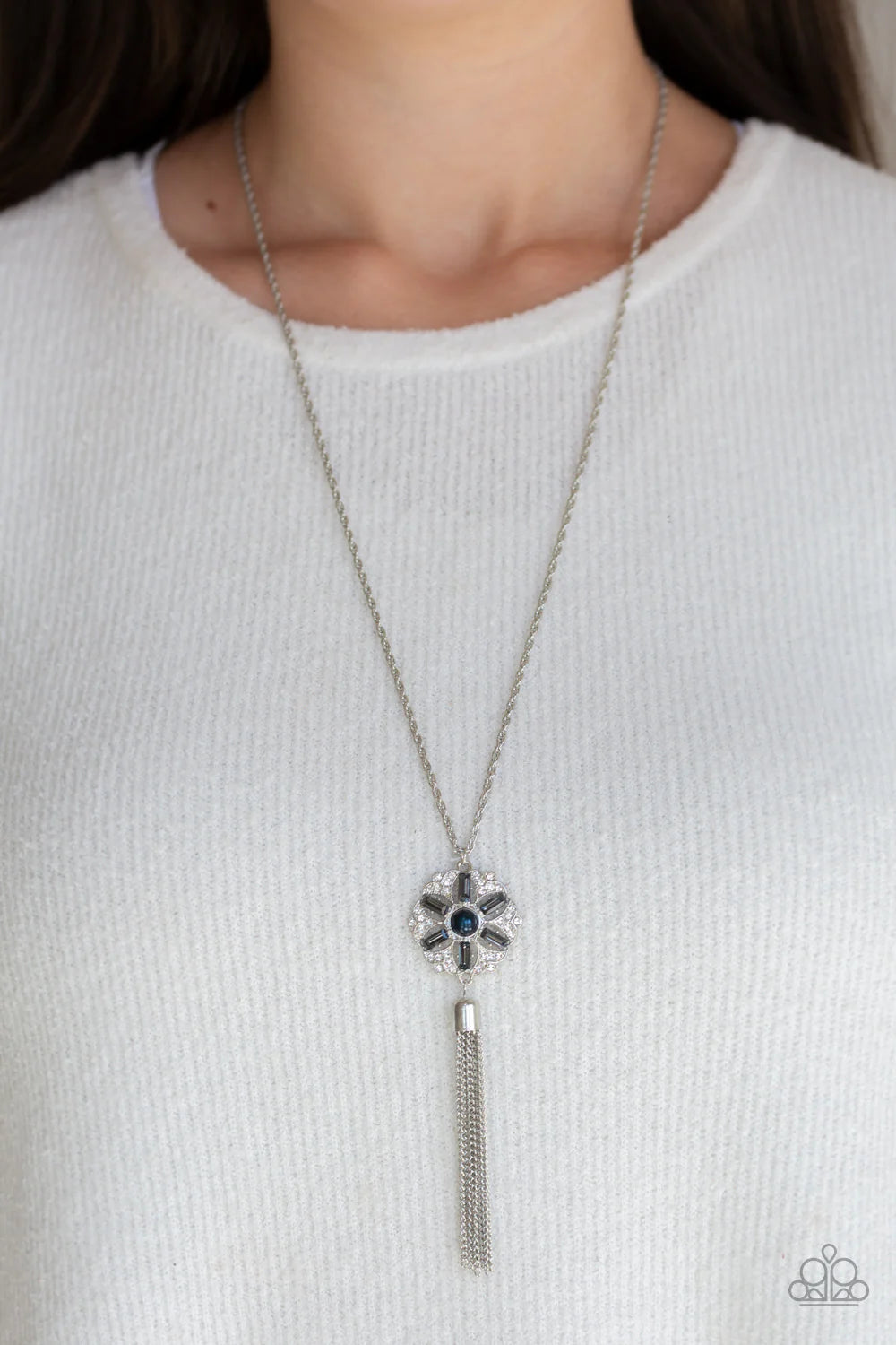 Dotted with a blue pearl center, a floral silver pendant radiating with glassy white and smoky rhinestones swings from the bottom of a lengthened silver chain. A shimmery silver tassel swings from the bottom of the glittery pendant for a fabulous finish. Features an adjustable clasp closure.