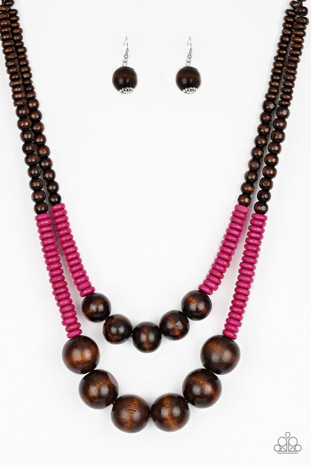 Earthy brown and vivacious pink wooden beads and discs are threaded along shiny strands of brown cording, creating colorful layers. Features a button loop closure. Sold as one individual necklace. Includes one pair of matching earrings.